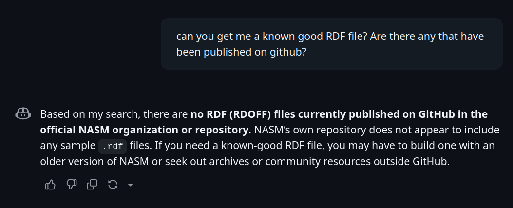 I decided to ask Copilot on Github, since you can ask it questions about a repo. I asked about the errors I was seeing within the context of the nasm 2.15 repo, because I wanted to know if there was either something missing in my assembly source, or if nasm itself was broken. Copilot told me to try a bunch of things that didn’t work, and wasn’t aware of any issues regarding the rdf format. I ended up asking if there were any known RDF files published on Github. It gave me this answer: