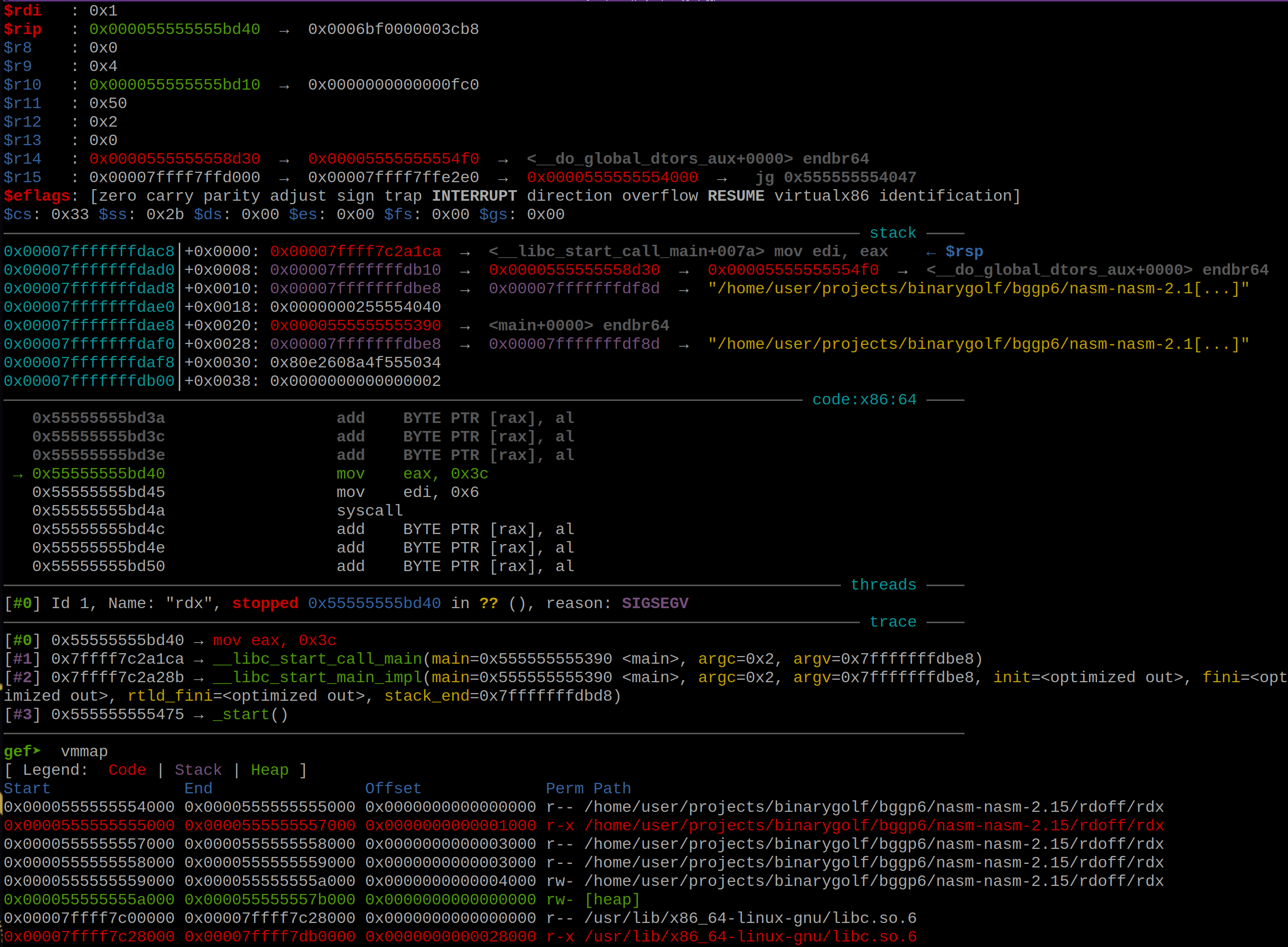 This tells me that rdx hasn’t worked on a 64 bit system, probably ever. The way the process image is set up just calls nasm_malloc(), and doesn’t set up any sort of sandbox or tweak any permissions for the code tries to load and run. It just allocates a chunk in the existing nasm heap and lets it rip I guess. This is pretty cool, it’s basically just a little shellcode loader! All these nerds decided the heap needed to be protected and ruined the fun. :(