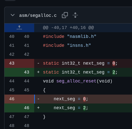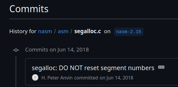 There are 3 calls to seg_alloc() that populate the segtext, segdata, and segbss variables. This lines up with the 3 required sections included in the assembly source. nasm seems to only be returning “2,4,6” instead of “0,2,4” as expected. What is seg_alloc() doing then? Let’s take a look at segalloc.c!