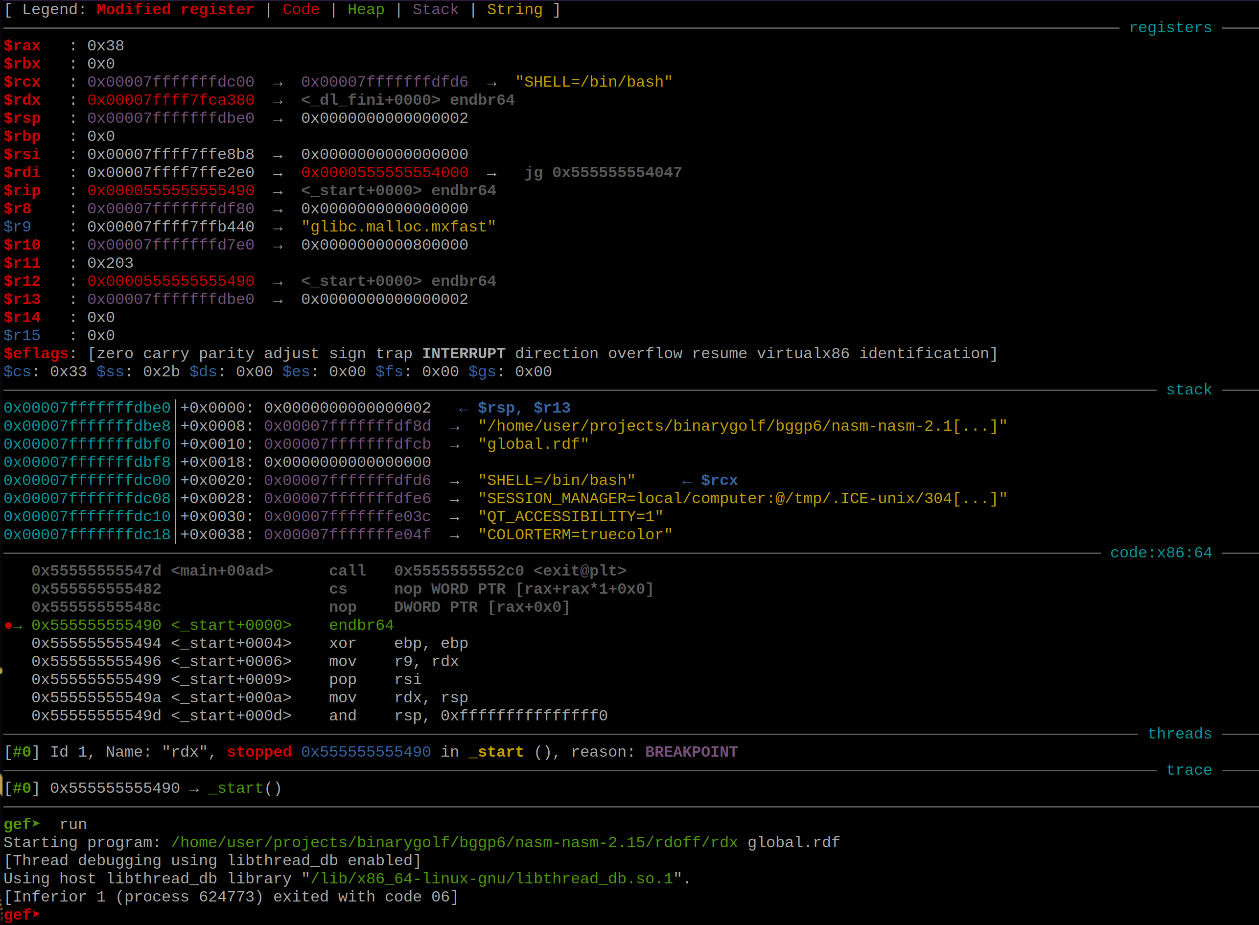 My main goal is to figure out how to generate and execute an RDOFF file using nasm’s rdx interpreter. Once this is complete, I want to golf the file to make it as small as possible.