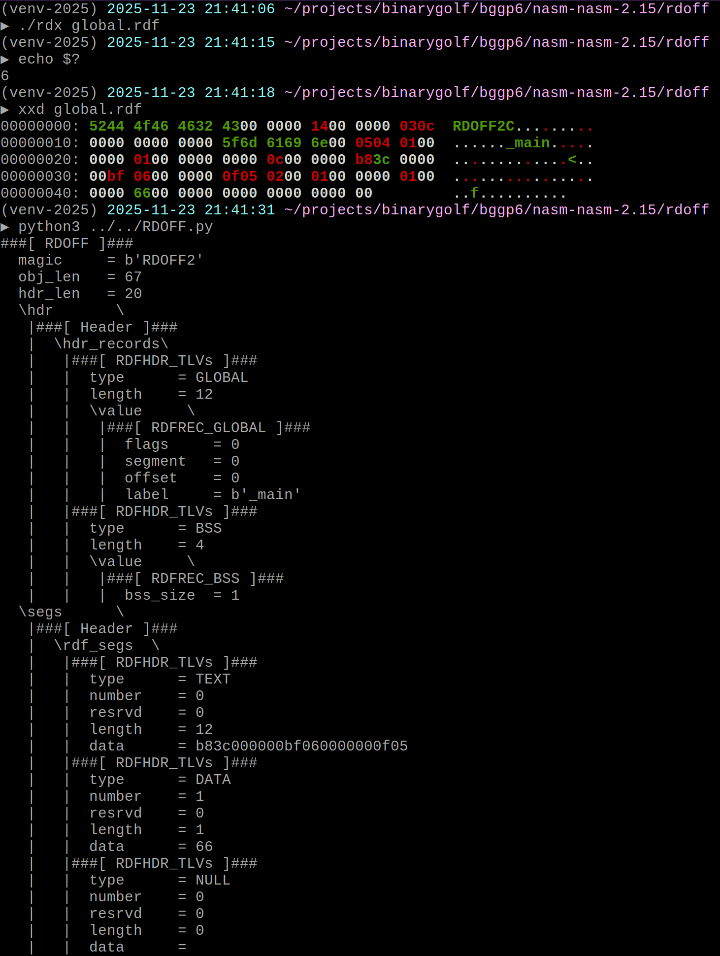 This year’s BGGP challenge is “RECYCLE”. Players are encouraged to recycle old ideas, lost projects, and obscure file formats to complete any of the previous 5 BGGP challenges, or just create the smallest file that prints/returns/displays the number “6”. After looking through some old notes on file formats I wanted to play with, I remembered a format called RDOFF. Years ago I wrote to myself “what are rdoff tools?” after learning that nasm shipped with support for it. There was even a package called nasm-rdoff. I didn’t know much about this format, other than it was some sort of internal object file. This sounded like a perfect for BGGP6 !